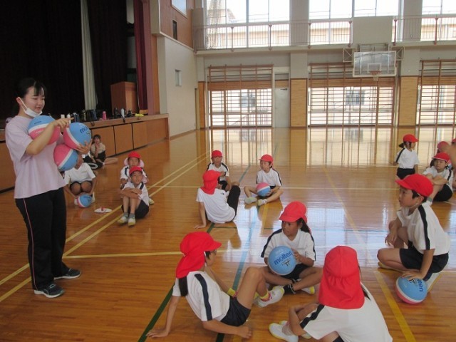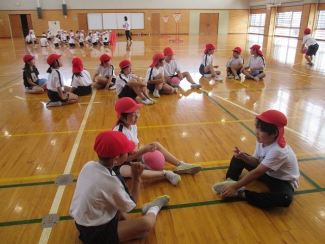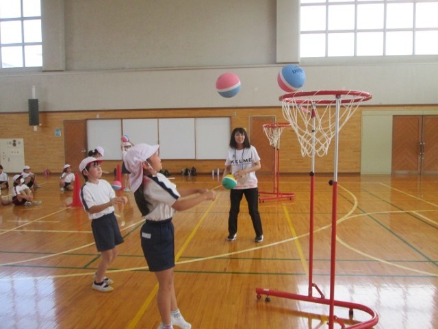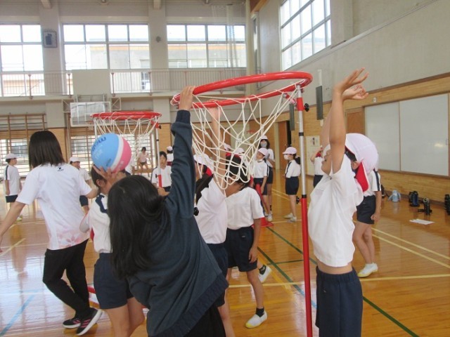 2、3,4組は体育です。2組はセストボールのゴールを出して入れる練習をしました。どうやったらうまく入るのか、考えながら取り組んでいます。