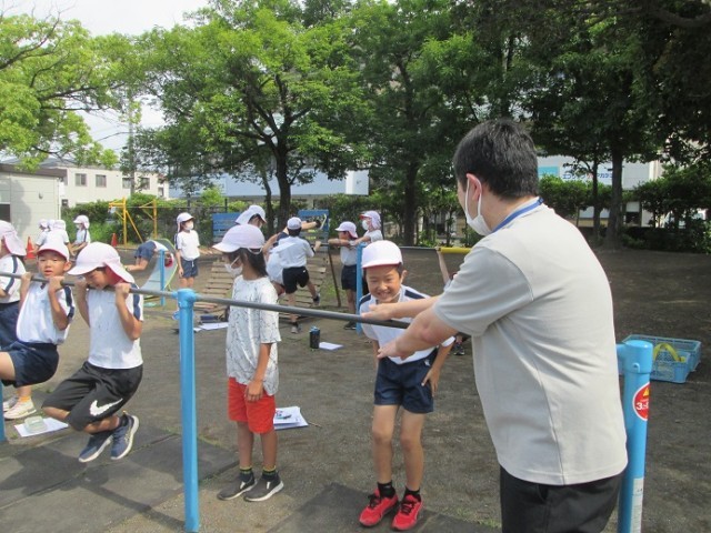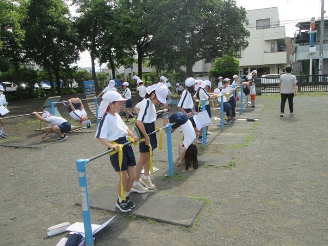 4組は、鉄棒運動です。逆上がり補助具を付けて、逆上がりに前向きにチャレンジしていました。できる技が増えてくるといいですね。