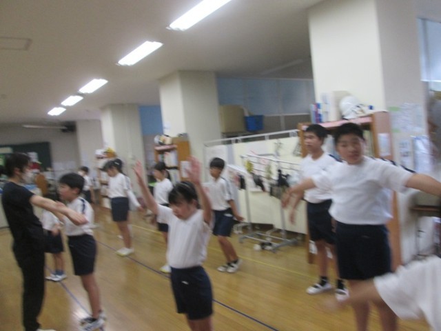 なかよし1~4組は、朝の運動です。CDを流す係もしっかりと仕事をしています。眠っている体を起こす大事な運動です。