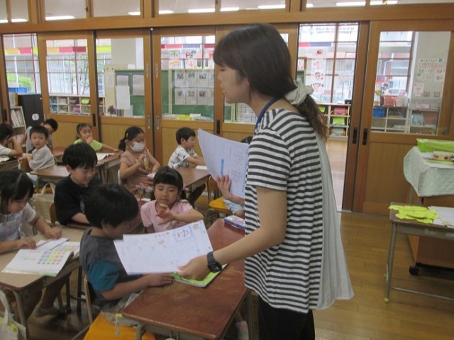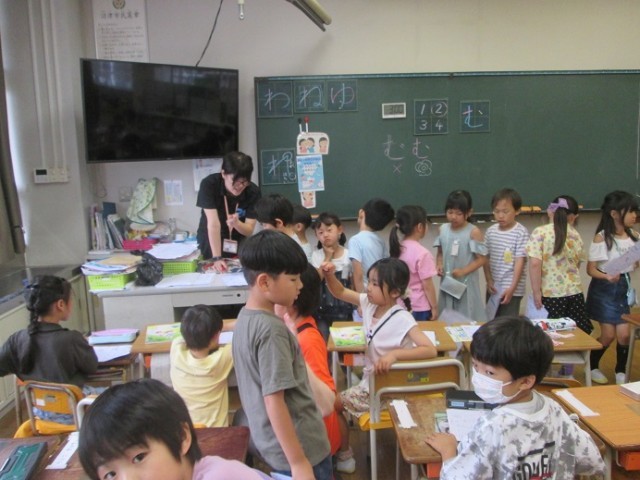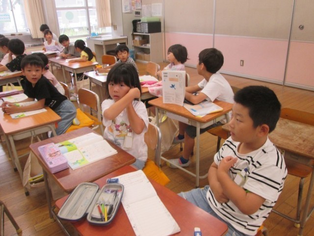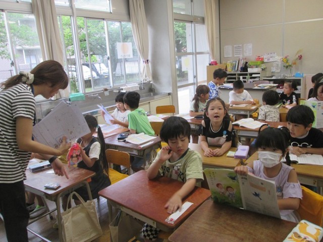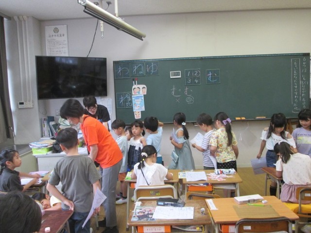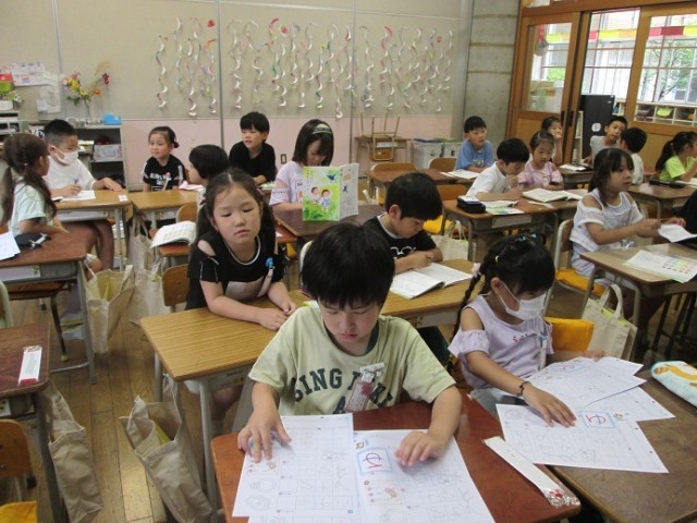 1年1組は国語のひらがなの学習です。1組は最後の文字「ゆ」の字のプリントに取り組みました。くるっとうまく書けたかな?