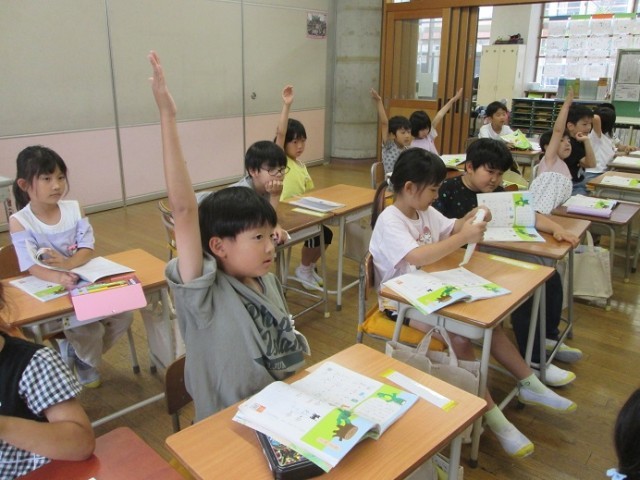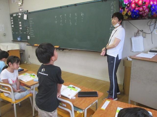 3組は国語「ねことねっこ」の学習です。小さな「っ」のつく言葉を探して、みんなで大きな声で言いました。発表も積極的です。