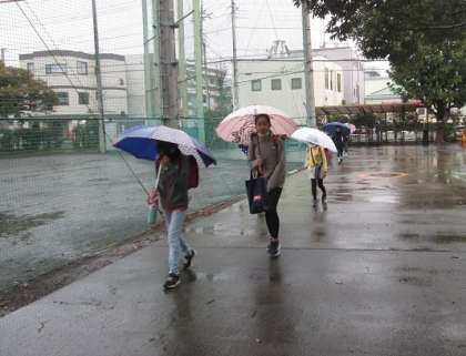 12/15(金)雨の週末を迎えました。子供たちは色とりどりの傘をさしながら登校しています。