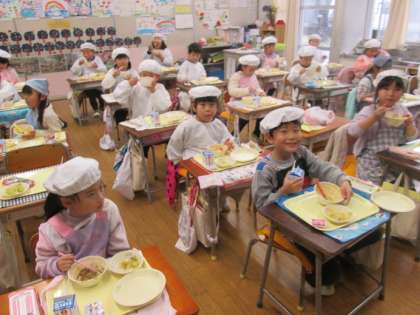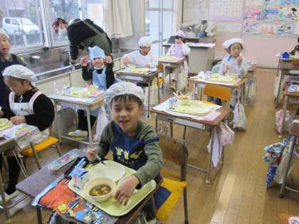 1年生の様子です。「カレーが一番好き〜!」「昨日もカレーだったよ!」(給食あるあるですね!)と言う子もいました。