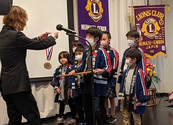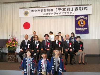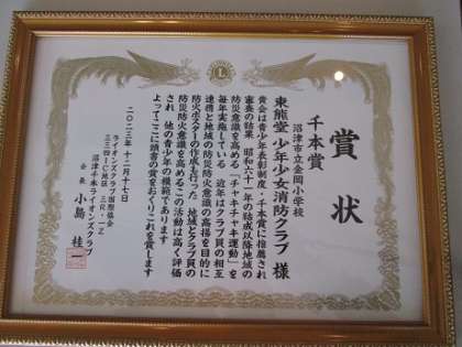 本日、静岡新聞社サンフロントビルにおいて、沼津千本ライオンズクラブ「千本賞」授賞式が開かれ、東熊堂少年少女消防クラブが表彰されました。