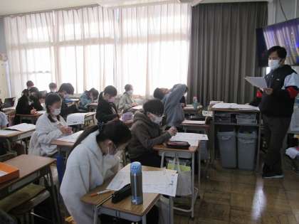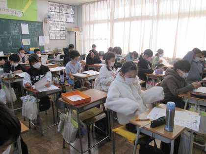 6年1組は算数のまとめのテストの確認です。「表だけでも式がないと減点されますよ」と細かいところまで解説があります。3学期はじめにテストがあるので力を発揮しましょうね。