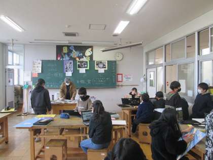 6年2組は、図工です。版画のまとめと鑑賞です。「カンガルーを彫っていたら足がなくなってしました!」という子もいました。それでも何とか彫りなおして頑張っていました。