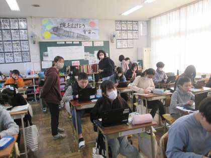 6年3組は英語です。「Welcome to ○○.」「We have a ○○.」などの文を完成させるため、Chromebookで調べながら書き込んでいました。
