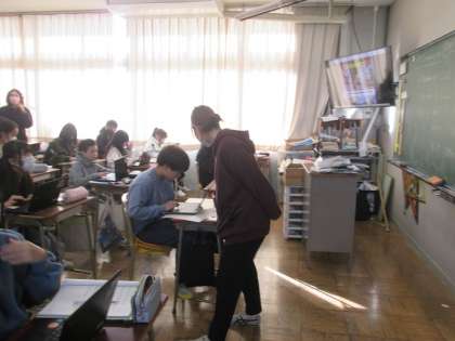 6年3組は英語です。「Welcome to ○○.」「We have a ○○.」などの文を完成させるため、Chromebookで調べながら書き込んでいました。
