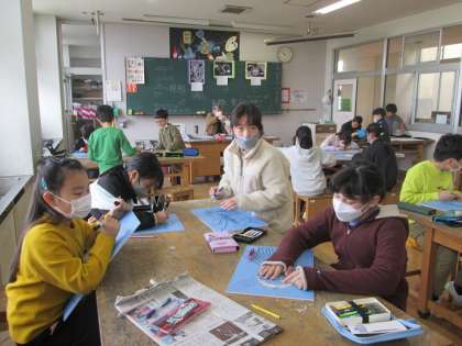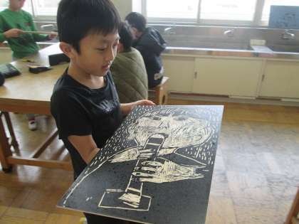 4年1組は版画です。「リコーダーを吹く様子」をダイナミックに描いています。刷り終わった子たちは冬休みの課題を考えているところでした。