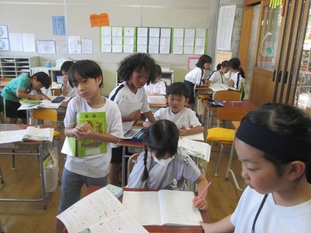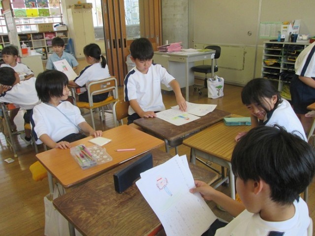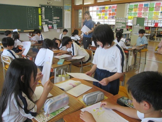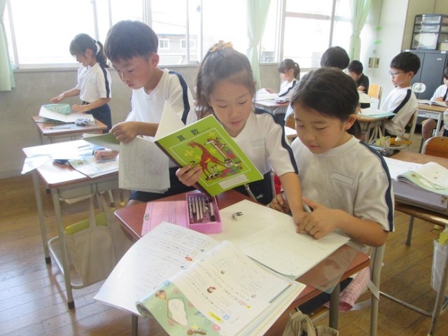 3組は国語「名前を見てちょうだい」の学習です。好きな場面を書いたプリントを班で回して読んでいます。友達の考えを知ることができました。