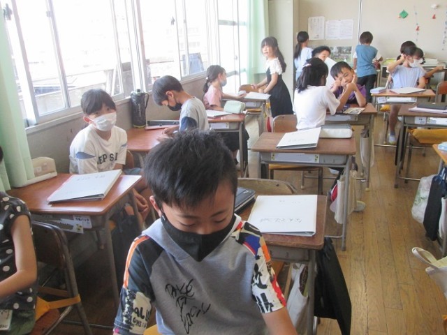 3年1組は算数のテスト返却です。「何でもファイル」が配られ、そこに綴りました。学習の足跡がたまっていきますね。