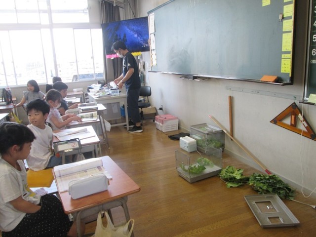 2組は理科です。ちょうど窓を開けて成虫になったモンシロチョウを外に放しているところでした。みんなが放したモンシロチョウがやがて卵を産み、その子供たちが帰ってくるといいですね。