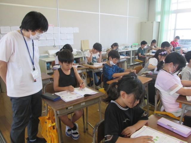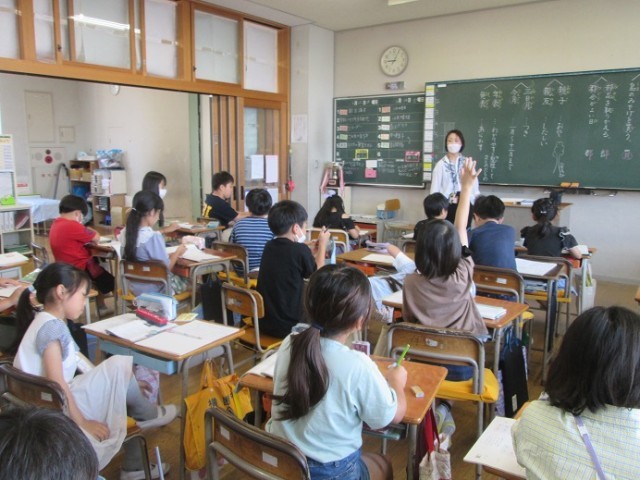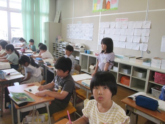 3組は、国語「漢字の表す意味」について、みんなで漢字の共通点を考えていました。員と買、都と部など共通するところはどこなのかを意見を出し合っていました。