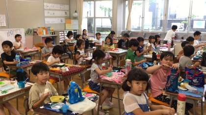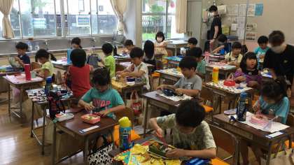 お昼の1年3組、4組です。給食もおいしいけれど、お弁当もとってもおいしいです。