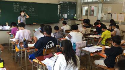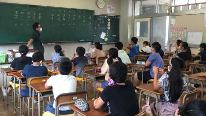 2学期初日、5年1組、2組の教室です。教室の中は、涼しいです。一歩教室から出ると、大変な暑さです。