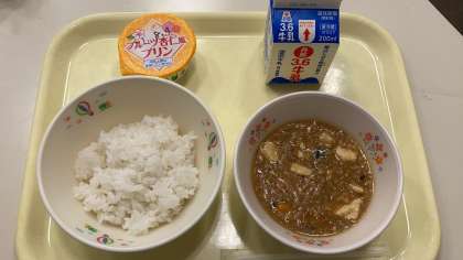 今日の献立は「ごはん・牛乳・茄子入り麻婆豆腐・デザート」です。ごはんと麻婆豆腐の組み合わせは、食がすすみます。