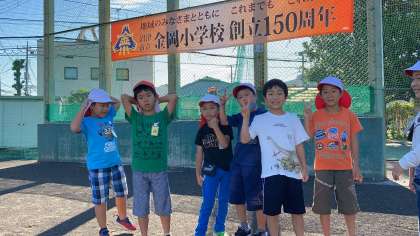朝の運動場です。創立150周年横断幕のあるバックネット前で、元気よく運動しています。