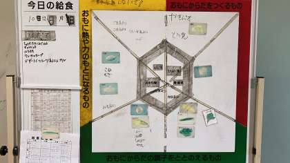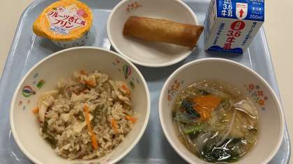 今日の献立は「中華炊き込みごはん・牛乳・春巻き・ワンタンスープ・フルーツ杏仁プリン」です。中華風のメニューです。