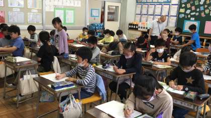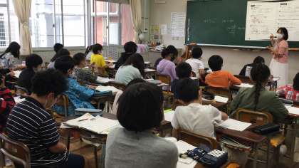 2時間目の4年1組、2組です。算数の学習をしています。整数÷整数の計算を工夫して解くために、考えたり、教え合ったりしています。