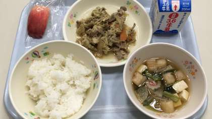 今日の献立は「ごはん・牛乳・豚肉の柳川煮・麩となるとのすまし汁・りんご」です。柳川煮は、ごはんの上にのせて食べてもおいしいです。