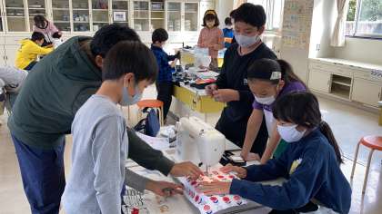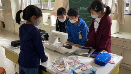 2時間目の5年生です。家庭科室が使用できるようになりました。今日は、ミシンをどう使ったらよいか、友達と教え合いながら学習しています。