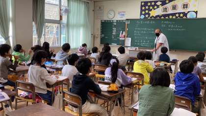 2時間目の4年生です。理科の学習では、太陽や月について学んでいます。月から地球まで光が2秒で届くことを知り、びっくりです。