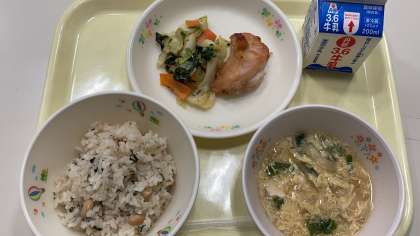 今日の献立は「じゃこと大豆のごはん・牛乳・鶏肉のみそ焼き・野菜の炒め物・かきたま汁」です・鶏肉のみそ焼きは、やわらかい鶏肉にみその香ばしさが加わり、とてもおいしいです。