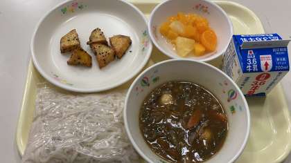 今日の献立は「うどん・牛乳・カレー南蛮・大学芋・フルーツサラダ」です。カレー南蛮うどんにして食べます。大学芋もほくほくしていておいしいです。