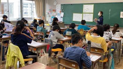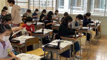 2時間目の5年生です。4組は、国語のテスト、3組は書写(毛筆)です。集中してがんばります。