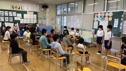 仲よし交流会の様子です。金岡校区にお住まいの友達との交流会です。みんなで「世界中の子どもたちが」を歌いました。