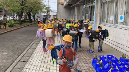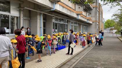 1年生は、本日も集団で下校します。雨がやんだので、かさをささずに下校できそうです。