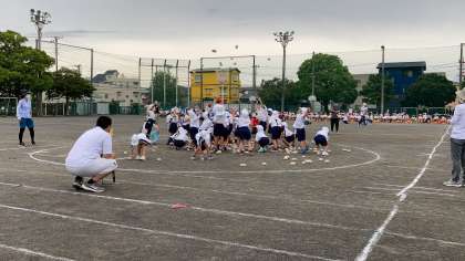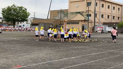 1年生団競「玉いっぱいになあれ」です。どの学級も、かごが玉いっぱいになりました。