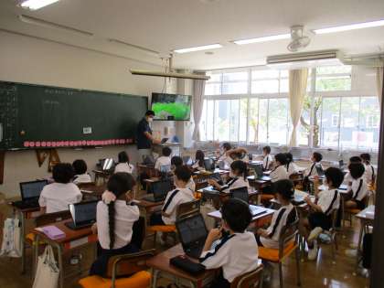 2時間目の1年生です。大型モニターやノートパソコンを活用した学習の時間が増えてきています。