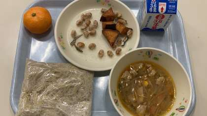 今日の献立は、「中華麺・牛乳・みそラーメン・さつま芋と大豆のから揚げ・みかん」です。みそラーメンスープには、もやしやたまねぎ、豚肉など具だくさんで、みそ味とよく合います。