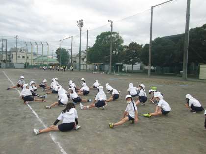 3時間目がスタート。1年生もしっかりしています。すぐ集合し、並んで準備体操をしています。