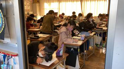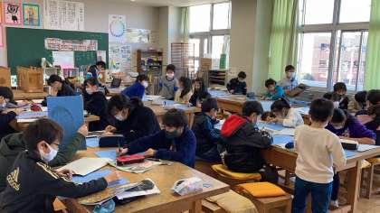 2時間目の5年生です。1組では、昨日の自然教室の思い出を新聞にまとめていました。