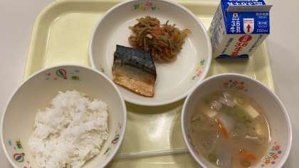 今日の献立は、「ごはん・牛乳・鯖の照り焼き・切り干し大根の含め煮・豚汁」です。鯖の照り焼きは骨もなく、皮まで食べることができます。