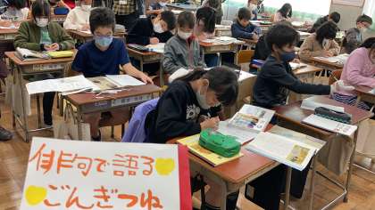 9日(金)、2時間目の4年3組です。国語「ごんぎつね」の学習です。登場人物の気持ちを俳句や絵で表しながら、読み取りを深めていくことができました。