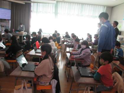 3時間目の2年生です。2年生は、生活科で「赤と白の二十日大根」を育てています。今日は、元気に育った二十日大根の成長の様子を写真でまとめる学習をしました。明電舎の方々に支援していただいたり、子供たち同士で教え合ったりする中で、「できた!」と、満足そうでした。