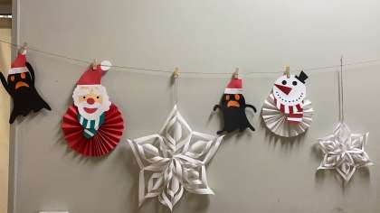 クリスマスが近づいてきました。学校の中にも、いろいろなところに飾りがあります。事務室前の壁にも楽しい飾りがあります。