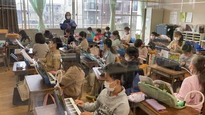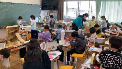 3時間目の2年生です。図工の学習では、家から持ってきた箱などを使い、世界に一つの「ともだちハウス」作りに挑戦しています。