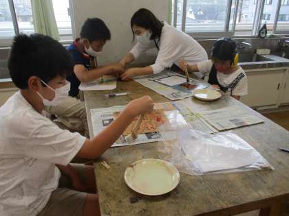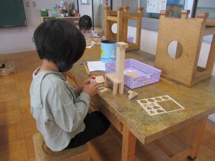 3時間目の仲よしです。図工で、木を使った製作をしています。ニスを塗ったり、くぎをうったり、がんばっています。