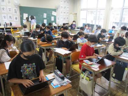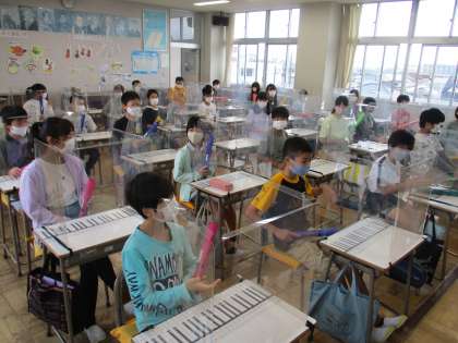 3時間目の6年生です。4組は音楽の学習です。手に持った棒をたたくと、色によって違う音が鳴ります。みんなで演奏会です。