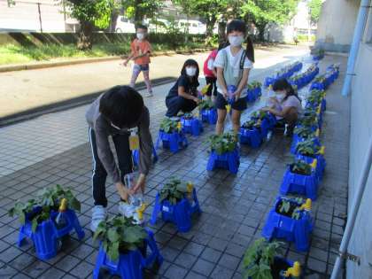 1年生はアサガオを育てています。毎朝必ず水をあげています。だんだん大きくなってきました。