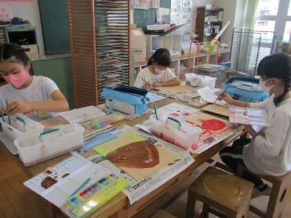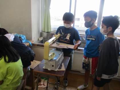 2時間目の5年2組です。図工の学習です。電動糸のこぎりを使って、作品を作って行きます。