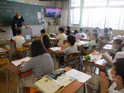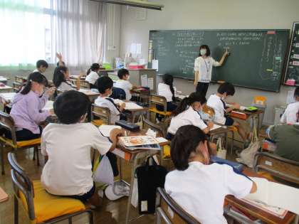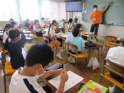 2時間目の3年生です。1組では、算数の学習で「あまりのある割り算」について学んでいます。