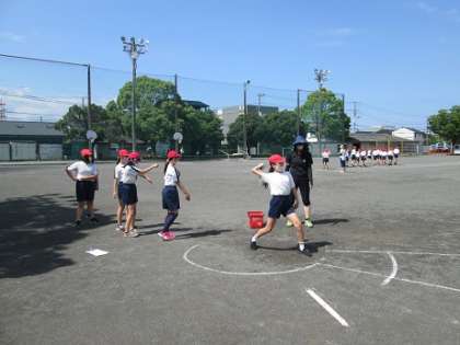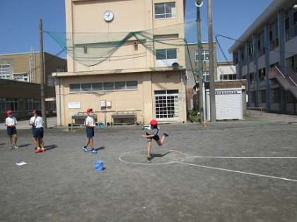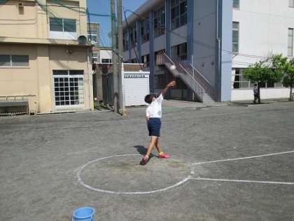 ソフトボール投げの様子です。愛鷹山を目指して、ボールを投げました。