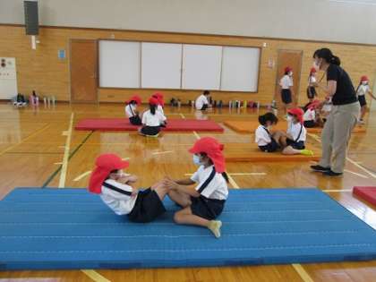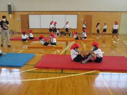 上体起こしの様子です。感染対策の観点からマスクをしながら、黙々と上体起こし運動を行っています。
