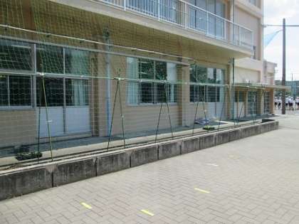 用務員さんがグリーンカーテン用ネットを設置しました。育てているゴーヤなどが上に伸びていくようにしました。