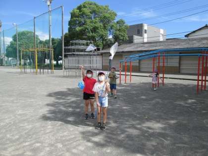 みんなでセミ取りを楽しんでいます。屋外では、セミの大合唱が続いています。